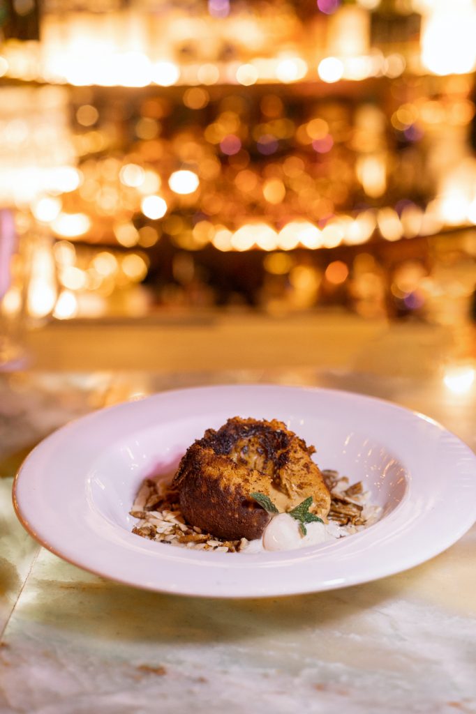 Volcán de dulce de leche, con almendras y nuez, acompañado de una bola de nieve de vainilla