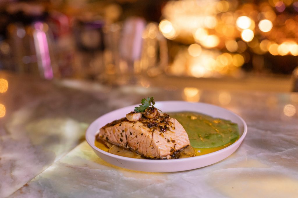 Salmón a la mantequilla con especias y un toque de chipotle, acompañado de papas Saratoga, cebollitas y puré de chícharos.