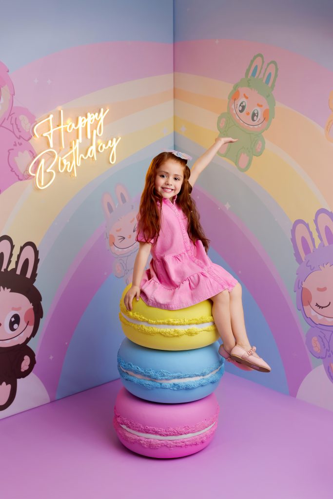 Las sesiones de cumpleaños tipo SPOTS y las temáticas estacionales, como Navidad, están en tendencia. Creamos escenarios sencillos y atemporales, como un pastel gigante de utilería para los cumpleaños. Lo recargado ya no va; lo simple volvió para quedarse.
