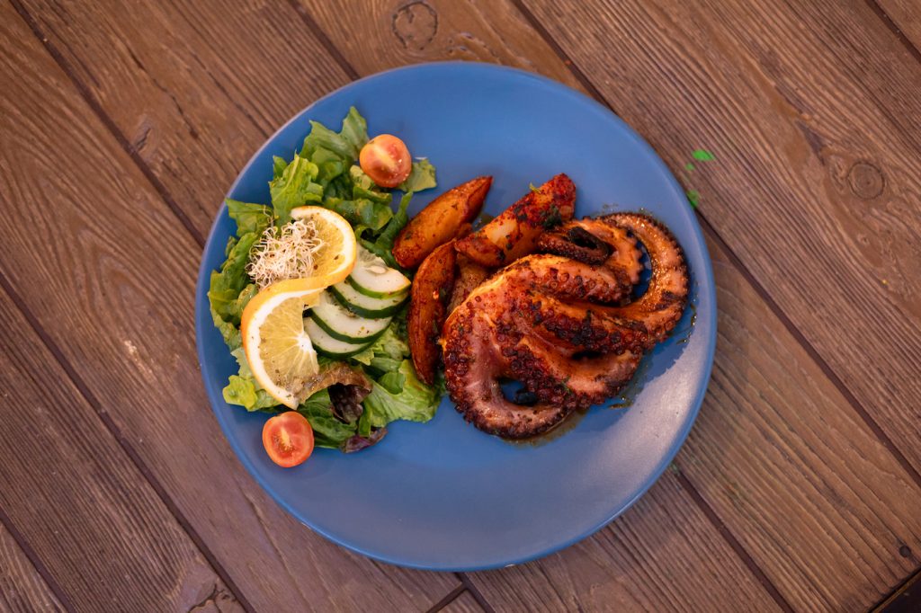 Pulpo marinado y cocido a la parrilla, servido sobre papas gajo salteadas con chiles quebrados y perejil. Un platillo lleno de sabor, con la suavidad del pulpo y el toque ahumado de la parrilla.