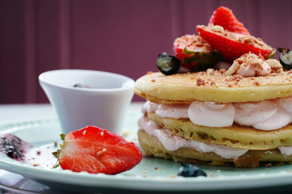 Son el equilibrio perfecto entre lo dulce y lo esponjoso. Capas de hotcakes suaves, acompañadas de un delicado betún de fresa, fresas frescas, arándanos y bolas de queso crema, servidos con su mermelada casera.