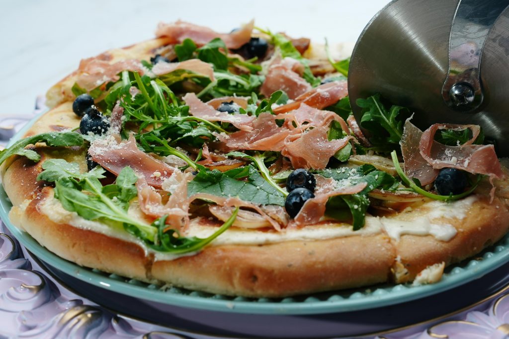 Pizza Serrana: Un deleite que combina jamón serrano, aderezo de blue cheese, cebolla caramelizada, arúgula, arándanos y parmesano.