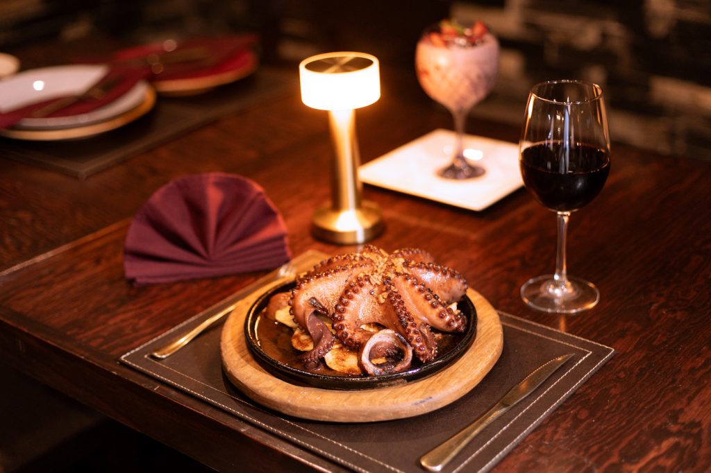 Pulpo asado al carbón, sazonado con aceite de ajo, paprika, dashi y vino blanco, servido en skillet y acompañado de papas Saratoga.