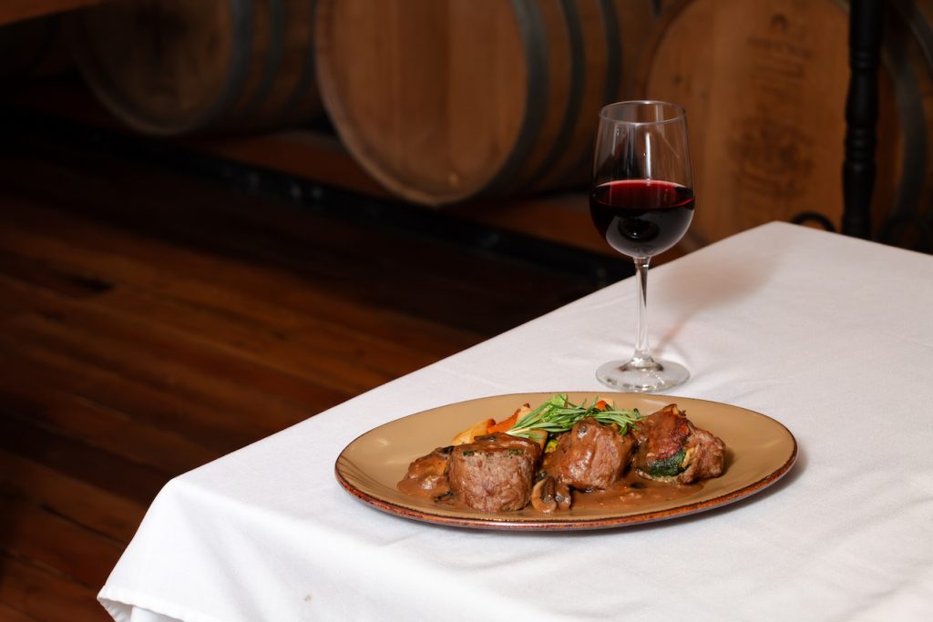 Filete de res acompañado de queso, pesto, jamón serrano, ajo y acelgas salteadas, servido con una salsa de champiñones, vino tinto y piñones tostados.