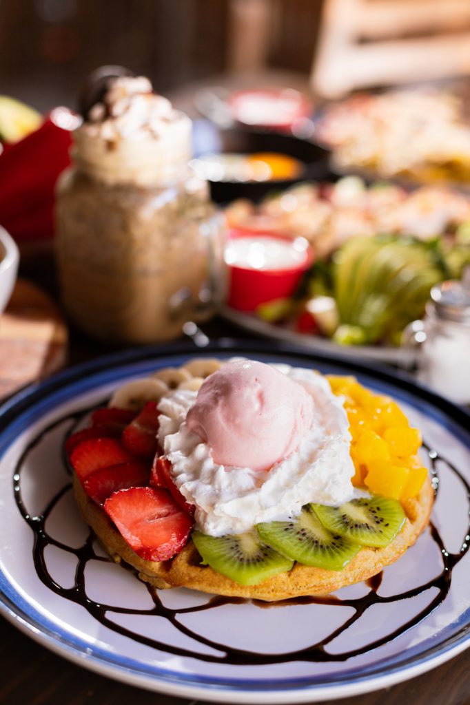 Waffles dulces: Un manjar esponjoso, acompañado de una variedad de toppings que incluyen frutas frescas, crema batida, miel de maple o chocolate derretido. Cada bocado ofrece una mezcla perfecta de textura crujiente por fuera y suave por dentro, convirtiéndolo en una opción ideal para quienes buscan un desayuno dulce y reconfortante.