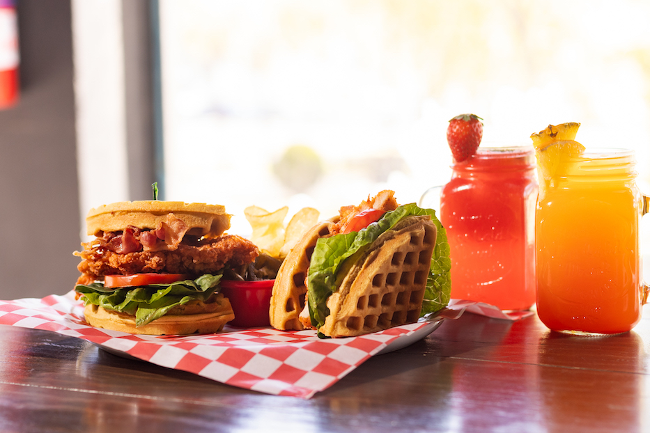Waffle Sándwich: Una innovadora combinación de sabores y texturas. En lugar del pan tradicional, se utiliza un waffle esponjoso y crujiente como base, que se rellena con ingredientes frescos y sabrosos. Este sándwich se sirve con pollo crujiente acompañado de tocino, lechuga, entre otros ingredientes, creando una mezcla perfecta entre lo dulce del waffle y lo salado de sus componentes. Es una opción única y deliciosa para quienes buscan un desayuno creativo y lleno de sabor.